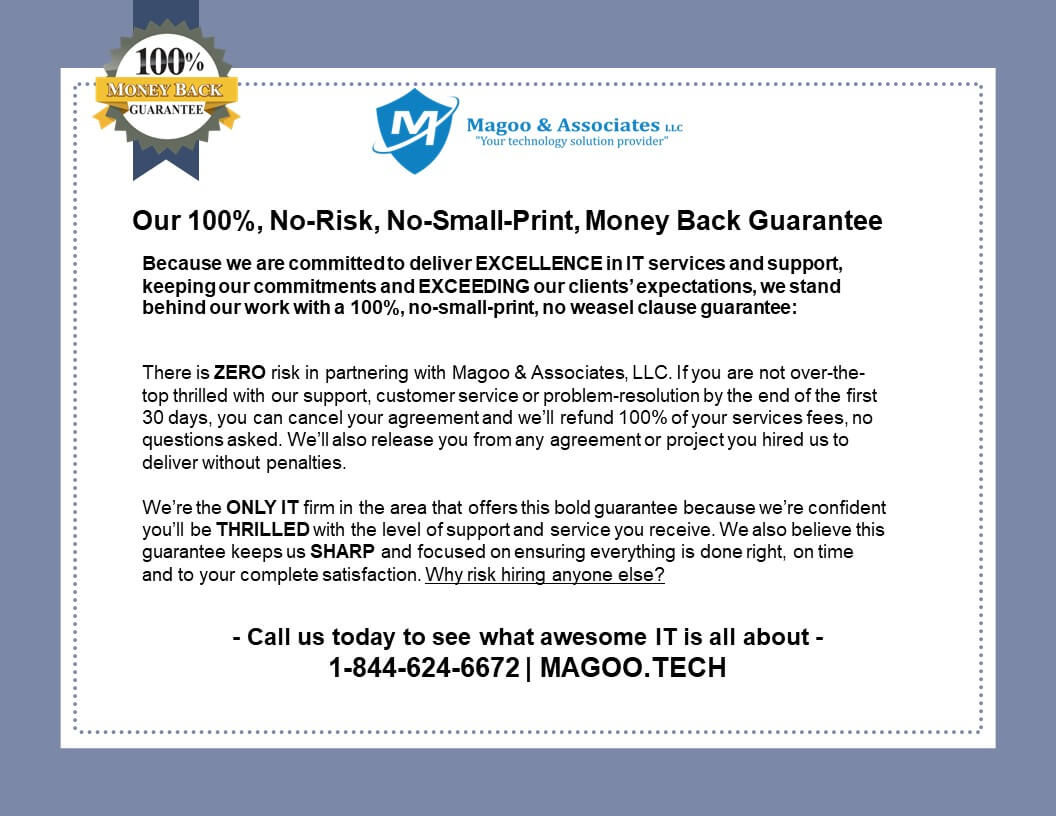 We’re the only IT firm in the area that offers this bold guarantee because we’re confident you’ll be thrilled with our level of service and support.